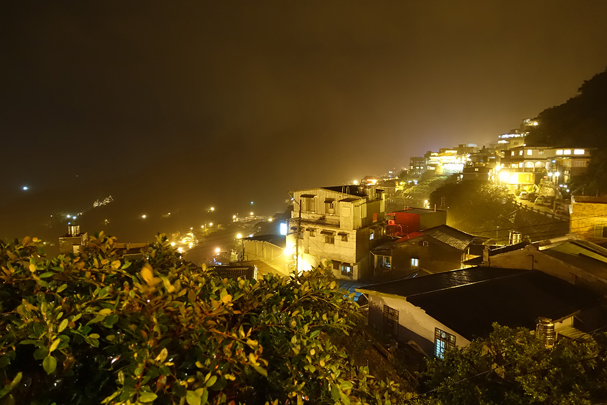 This was one of the few photos I was able to get without tons of tourists or blurred by rain (sorry!). Despite our rigorous video game training when we were kids, we were unable to avoid getting a bit drenched making our way through town so we ducked into the Jiu Fen A Mei tea house to escape the rain and dry off a bit. We had hoped the rain would subside but it only came down harder the longer we waited. There was nothing else for it but to brave the elements and head out for dinner. We stopped by a small local establishment where we could have a nice view of Jiufen. The clouds and rain made visibility difficult but we did see a nice night view of the town.