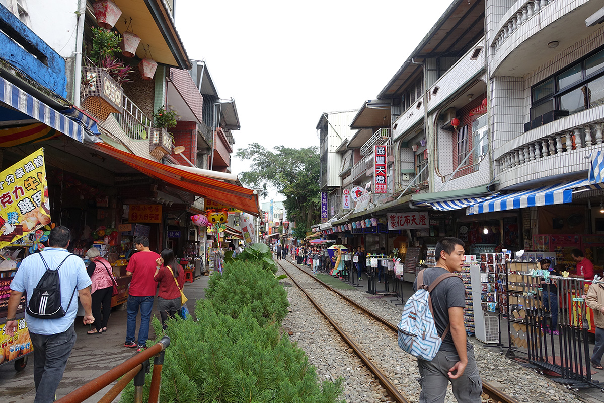 The main thing is to avoid the train when it comes through town, of course. 😉 Like Pingxi, this town is on the side of a mountain so walking behind the buildings in the photo above reveals that only the top floors were visible from the old street level and the buildings extended down the mountain.