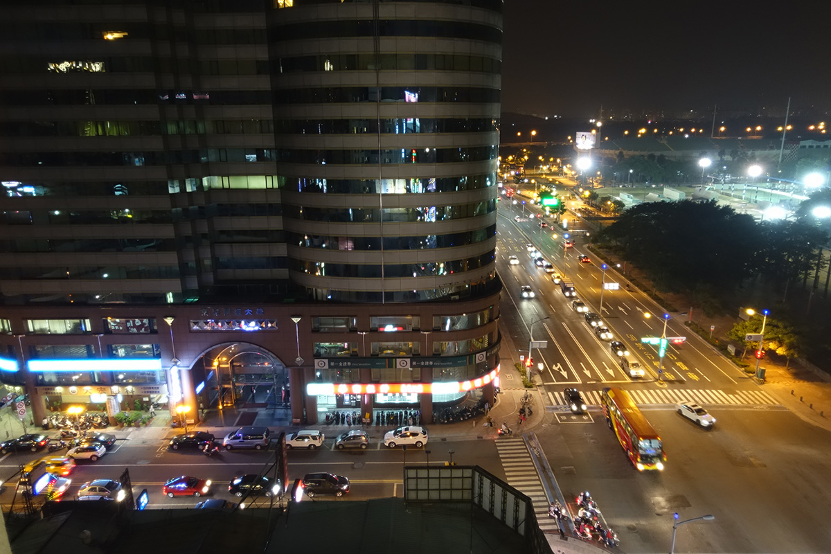 The bed looks a lot more comfortable than it really was, though. Beds in Taiwan (and my host tells me Asia in general) tend to be quite firm, ranging from the feel of sleeping on a wooden slab to sleeping on a wooden slab with a 1-2″ bit of foam on top. Western beds tend to be more cushioned with more give so it’s a bit different sleeping on these Taiwanese beds. Our guide explained that sleeping on a hard surface is really good for one’s health. My back is having a hard time adjusting to that, unfortunately. Having said that, the pillows at this hotel were super soft and it was easy to fall asleep. Here’s a view from my room: