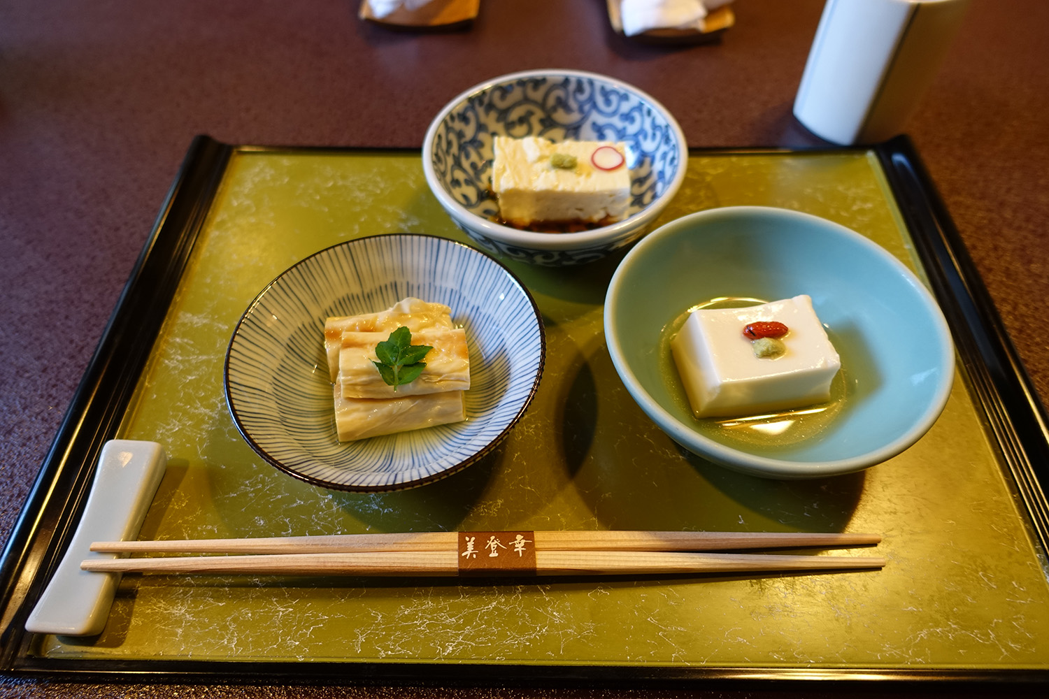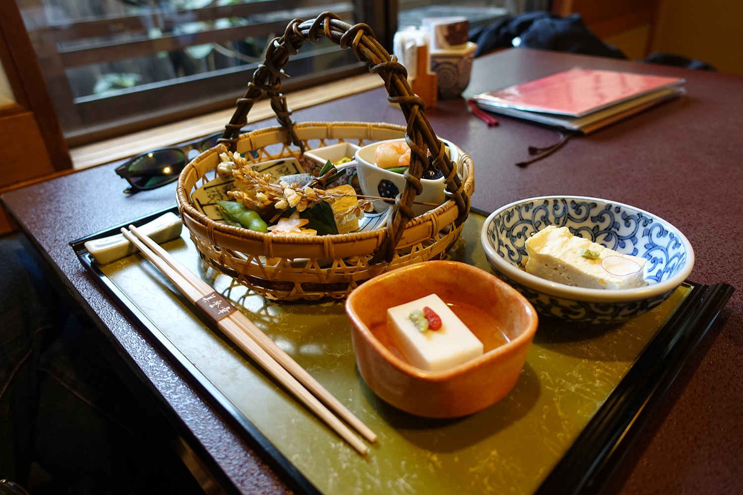 The place serves traditional kaiseki dinners but they require notice to prepare for that. We therefore had an abbreviated version which was quite tasty. I chose the vegetarian dinner and my first course was several different types of tofu.