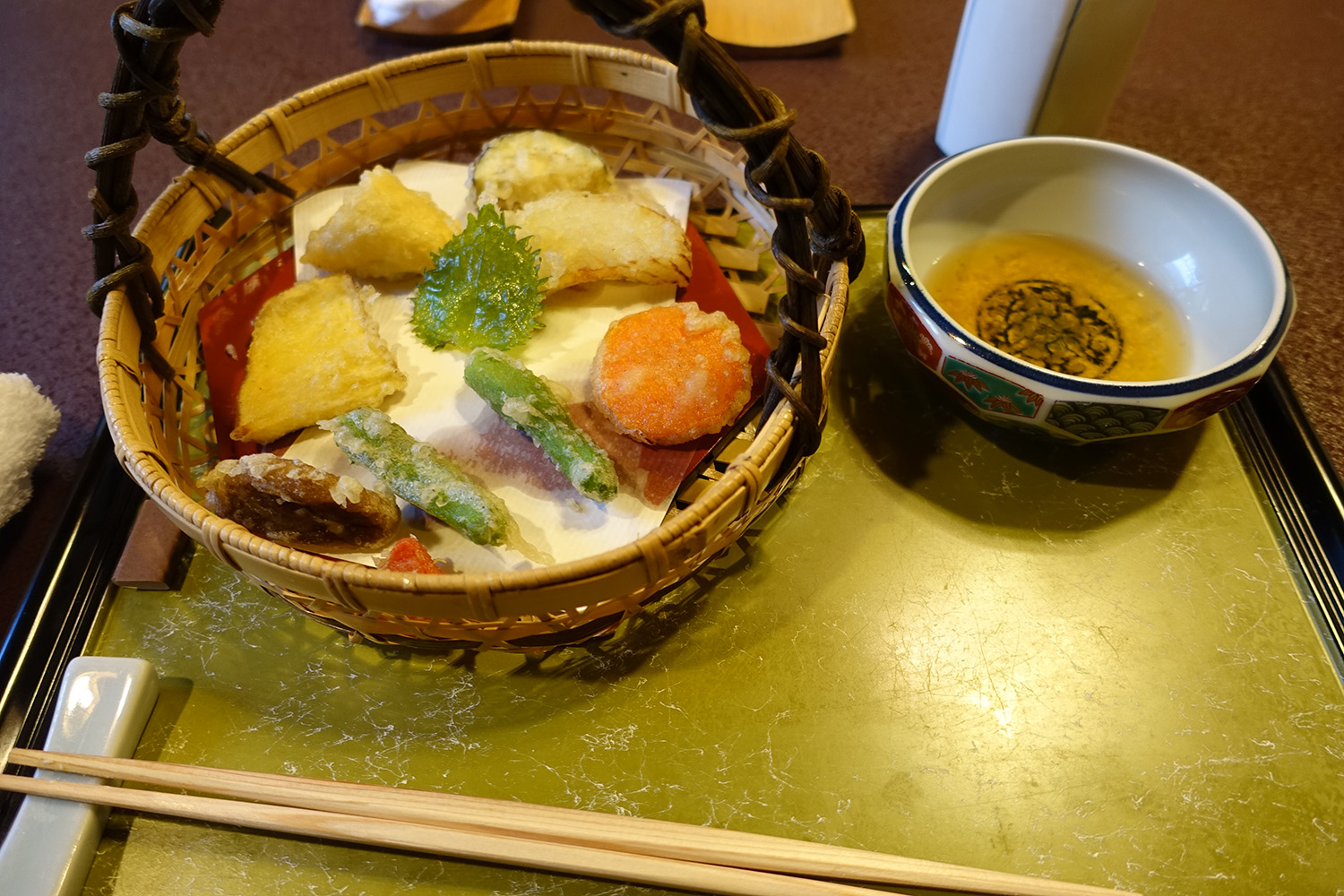There were couple of other tofu dishes that come out a few minutes later, including a broiled version and a boiled version, for which I was to boil the tofu myself. The tofu here was very silky and creamy – much better than the stuff we typically get in the U.S. My next course was tempura veggies.