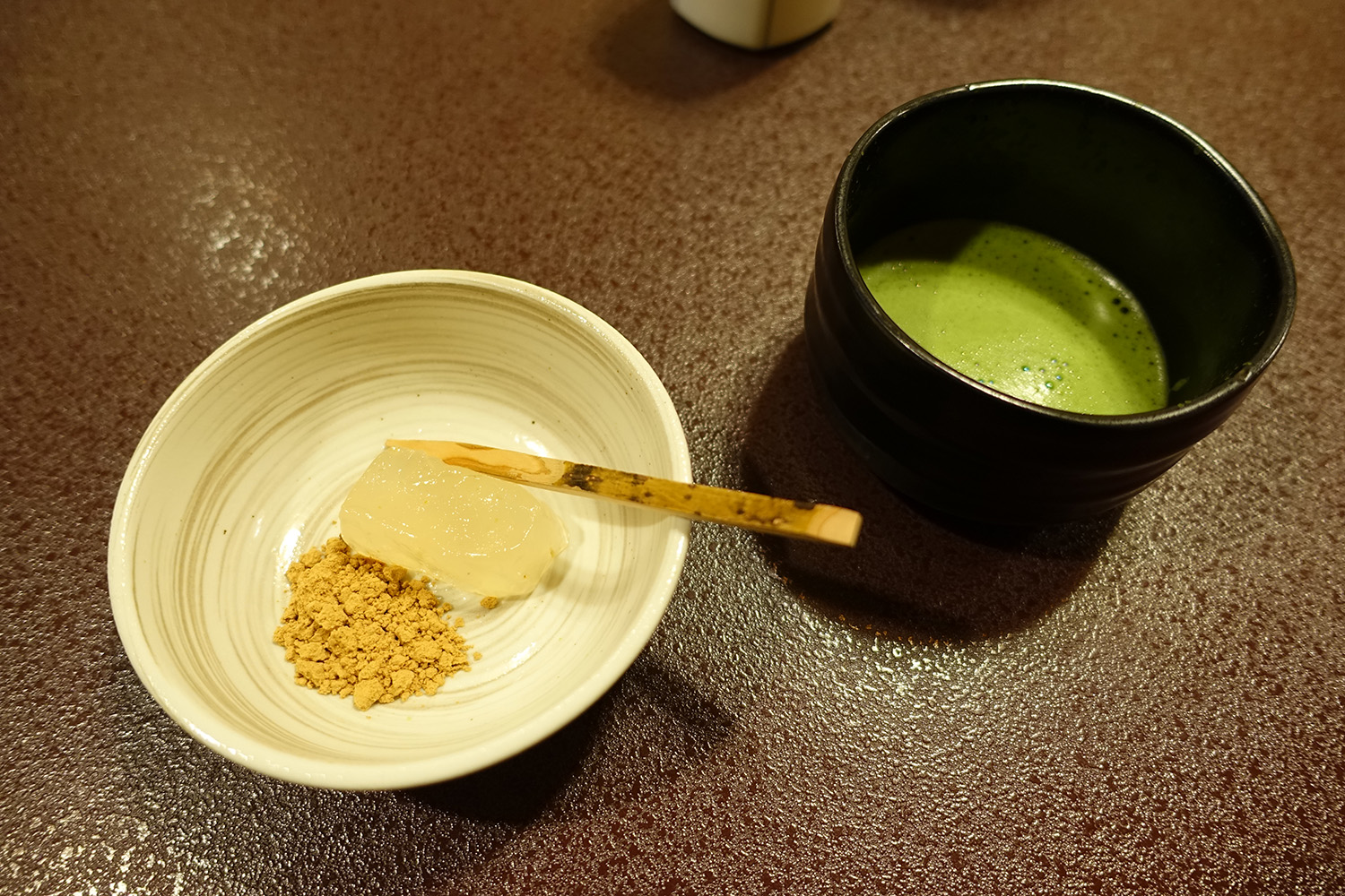 Our final course was dessert, including matcha tea and a clear mochi (warabimochi, perhaps?) served with kinako, a roasted soybean powder.