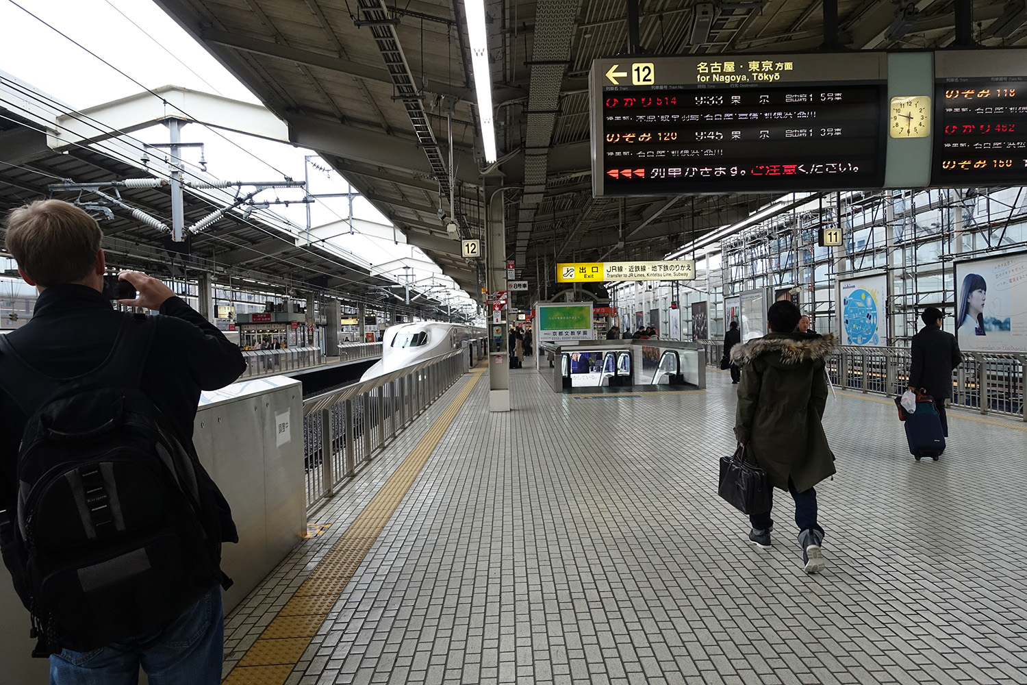 We caught a cab within a few minutes of leaving the house (much easier than in San Francisco!) and headed for Kyoto Station. We picked up some food and drinks and did a bit of souvenir shopping before heading to the platform. Here is a photo of the train we were to take pulling into the station.