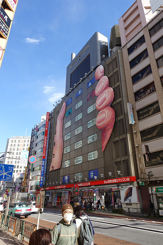 Bic Camera had a huge selection and we decided it would be best if we did a bit of research on what we wanted and the prices in the US before making any purchase so we walked around a bit more before heading home. One shop across the way had a huge mobile phone plastered on its facade.