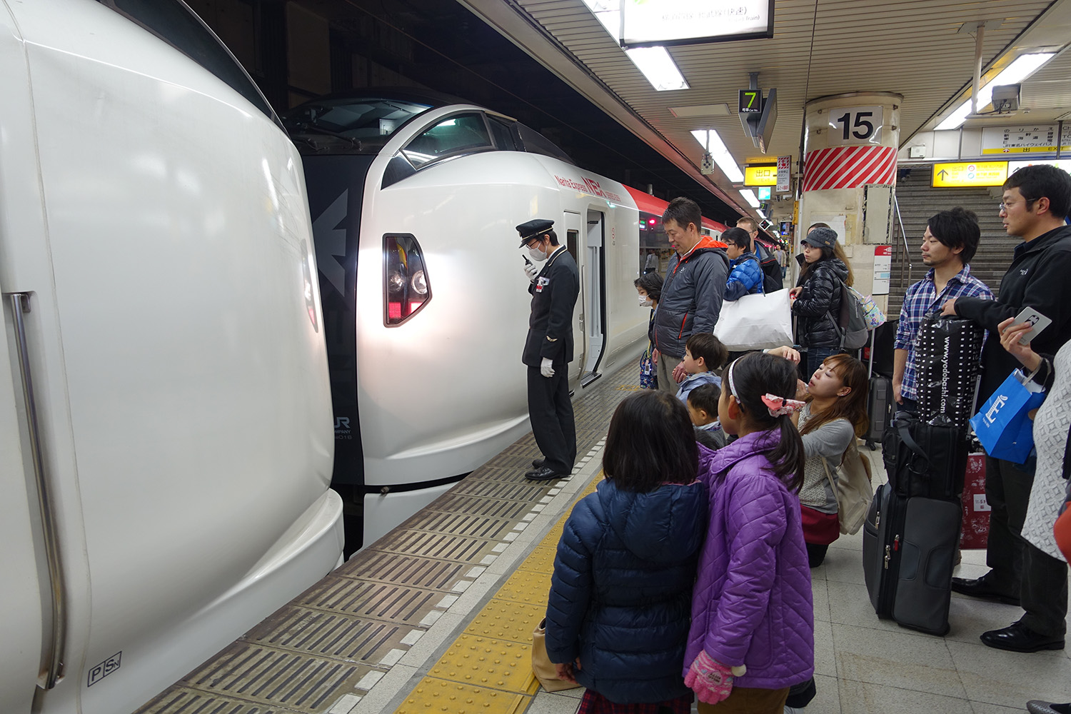 It was then that I remembered on our way from the Airport to Shibuya that the Narita Express train split into 2 when we stopped at Tokyo Station so we would have to wait for the train carrying cars 1-6 to join up with the train that had already arrived. As we waited, a crowd began to gather with some excited children and adults waiting nearby to see the coupling of the trains.